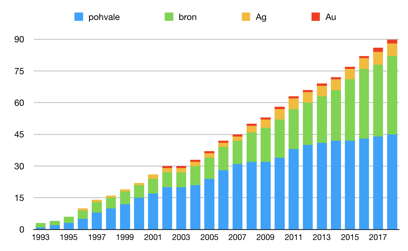 Takole so se nabirale pohvale in medalje, ki so jih na Mednarodni fizikalni olimpijadi osvojili slovenski dijaki od leta 1993 naprej, ko je Slovenija drugič sodelovala na olimpijadi kot samostojna država. Prvo sodelovanje leto prej je bilo poskusno, ekipa je štela le 2 člana (kasneje vedno 5). Na zadnji olimpijadi smo dosegli številko 90, kar je vsota 45 pohval (modra), 37 bronastih medalj (zelena), 6 srebrnih (rumena) in 2 zlatih (rdeča; prva leta 2002 in druga 2017). Leta 2003 je po svetu razsajal SARS, zato se slovenska ekipa olimpijade, ki je potekala na Tajvanu, ni udeležila.