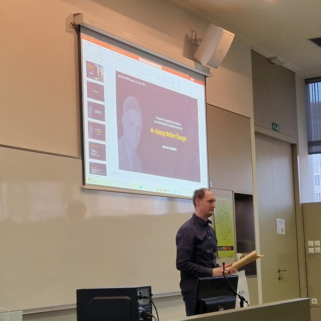 Finančni del nagrade v znesku ene povprečne slovenske bruto plače v letu 2025 bo prispeval DMFA Slovenije. Nagrajencu še enkrat čestitamo in želimo obilo raziskovalnih uspehov tudi v prihodnje!