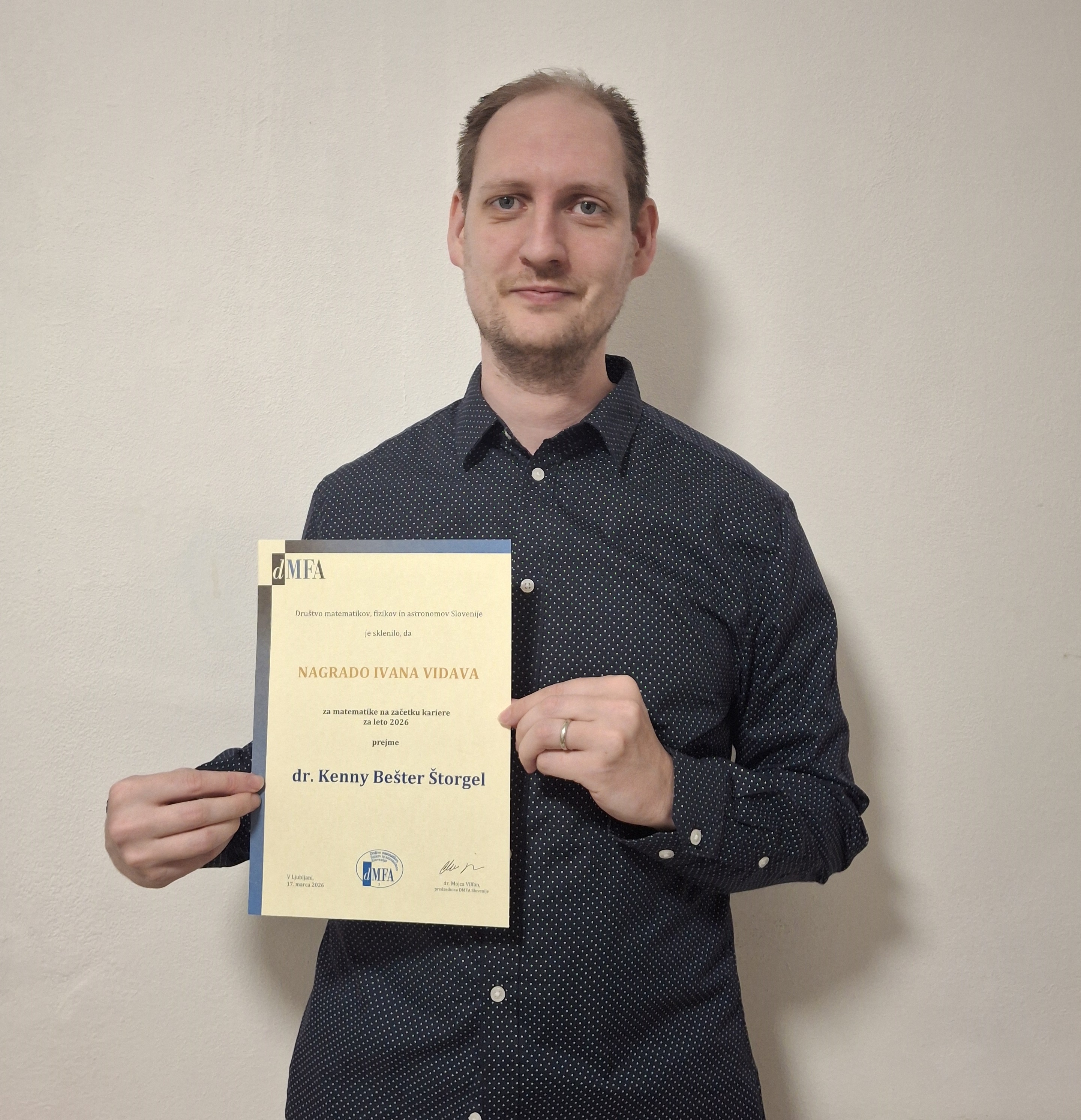 Od letošnjega leta dalje bo DMFA Slovenije vsaka tri leta podelilo nagrado za najboljše raziskovalne dosežke matematikov in matematičark na začetku kariere, ki so znaten del svojega raziskovalnega dela opravili na kateri od slovenskih ustanov. Za prvega prejemnika nagrade Ivana Vidava je bil med štirimi nominiranci izbran dr. Kenny Bešter Štorgel, ki je doktoriral leta 2023 na Univerzi na Primorskem. Strokovna komisija v sestavi prof. dr. Sergio Cabello Justo, prof. dr. Aleksey Kostenko in prof. dr. Marjeta Kramar - Fijavž je v utemeljitvi nagrade zapisala, da v raziskovalnem delu nominiranca izstopa izjemna serija treh člankov o drevesni širini grafov, ki je objavljena v najprestižnejših mednarodnih revijah s področja diskretne matematike (celotna utemeljitev komisije).