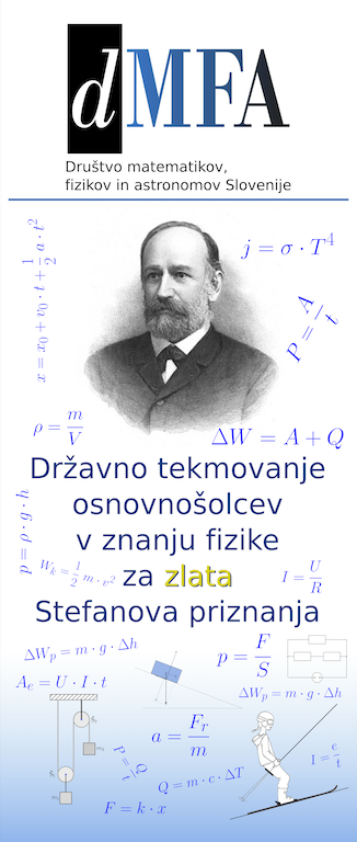 |  | Danes smo objavili uradne rezultate 37. tekmovanja iz znanja fizike za Stefanova priznanja. Čestitamo vsem nagrajencem in tudi vsem ostalim udeležencem državnega tekmovanja, pa seveda mentorjem! Nagrade najuspešnejšim mladim fizičarkam in fizikom bomo podelili na Bistroumih ... |