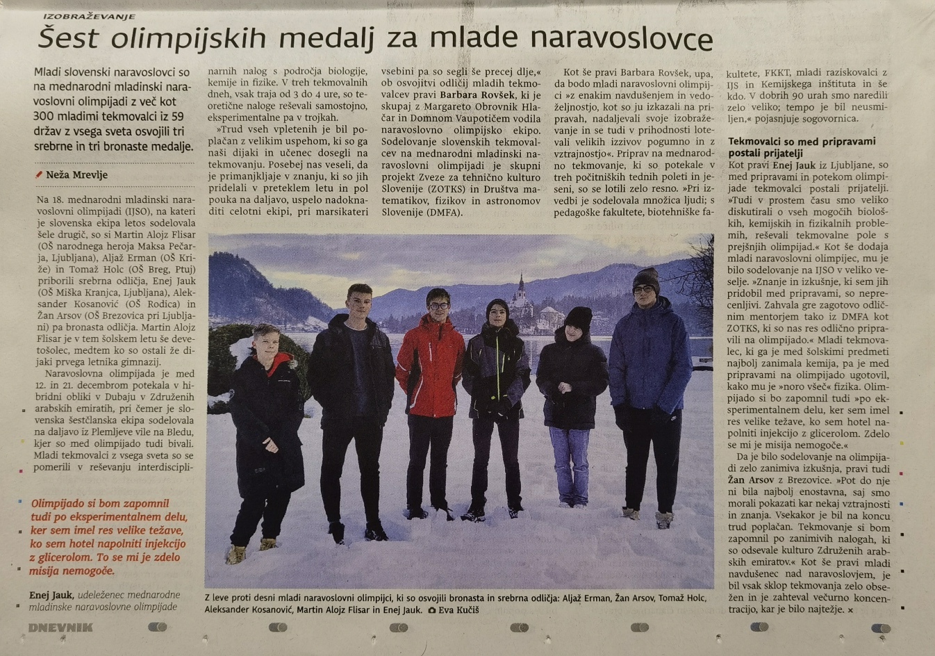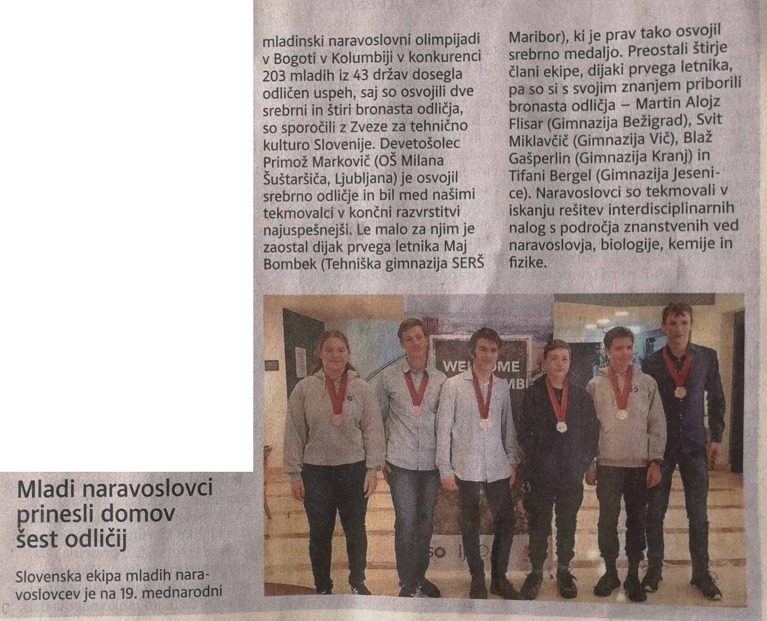Zasledili smo zapise o uspehu ekipe slovenkega učenca, dijakinje in dijakov na 19. Mednarodni mladinski naravoslovni olimpijadi: