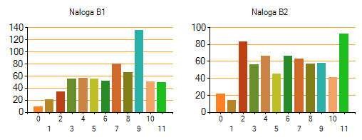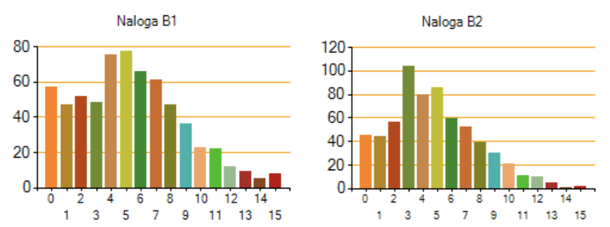 Na spodnjih diagramih so porazdelitve udeležencev področnega tekmovanja iz fizike v letošnjem šolskem letu po skupnih doseženih točkah in po doseženih točkah pri vsaki od obeh besedilnih nalog.
